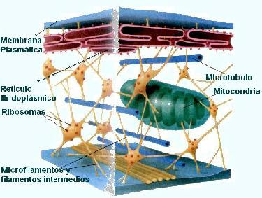 Es una red de filamentos que da forma a la célula, soporta su membrana plasmática, organiza sus estructuras internas e interviene en el transporte, movilidad y división celular.